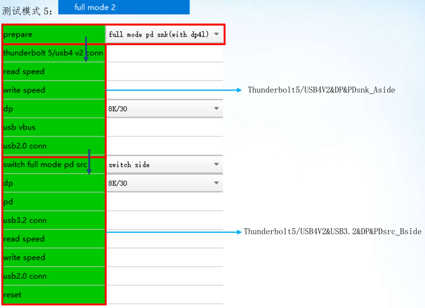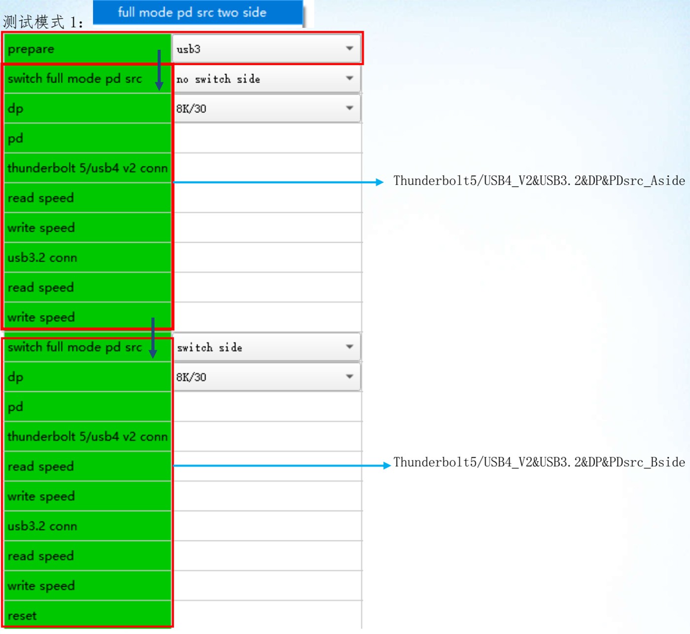 以上为当前测试软件预设的 6 个测试模式,其中红色方框内为测试项目设定,深蓝色的↓为下一个测试流程设定,其中后面的 swith side 代表切换对立 CC 来 cover 双 CC(CC1&CC2)。浅蓝色的→为当前测试模块的测试项目功能说明。